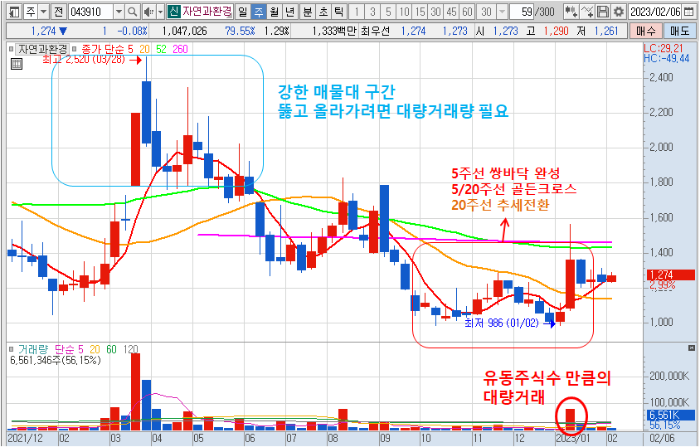 자연과환경 주가를 주봉 차트로 보면 22년도 상반기에 2천 원 초반에서 대량거래와 함께 캔들쌍봉으로 하락한 구간이 매우 강력한 매물저항대로 자리 잡고 있습니다. 최근 5 주선 쌍바닥을 만들고 5/20 주선 골든크로스를 통해 상승추세 전환을 시도 중인데 앞으로 대량거래가 여러 번 나와야 2천 원대 탈환이 가능해 보입니다.
