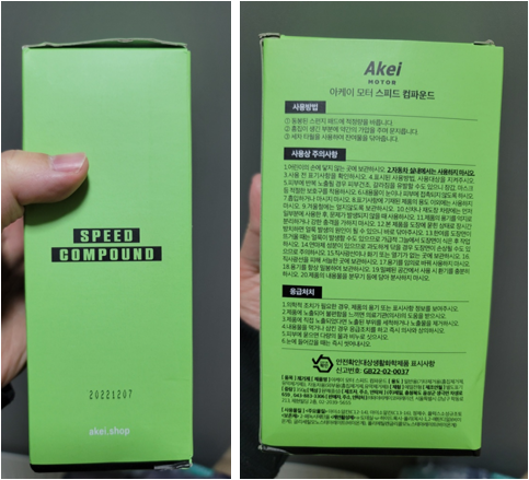 인생 자동차 스크래치 제거제인 아케이(Akei) 모터 스피드 컴파운드(350g) 각에는 사용방법, 주의사항 등이 적혀있습니다.