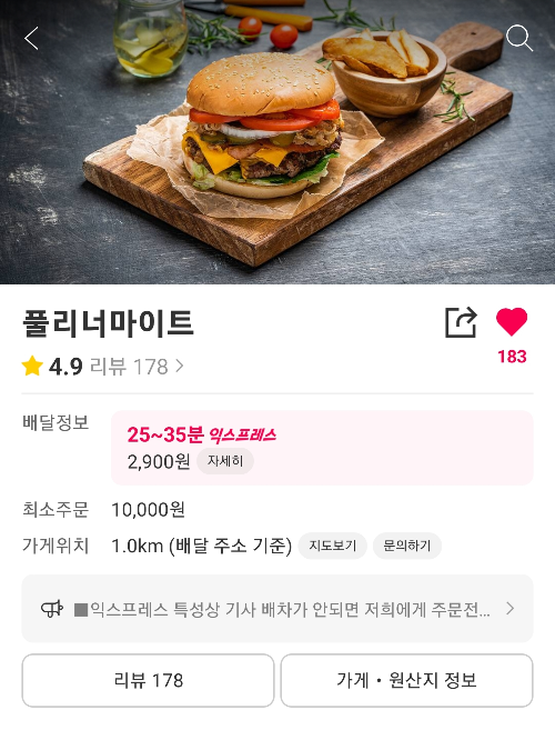 요기요 익스프레스 매장이라서 배달도 빨리오고 버거가 수제버거라서 큰데도 불구하고 모양이 그대로 잘 살아서 오는 걸 보면 배달에도 신경을 많이 쓰는 매장인 거 같습니다. 👍