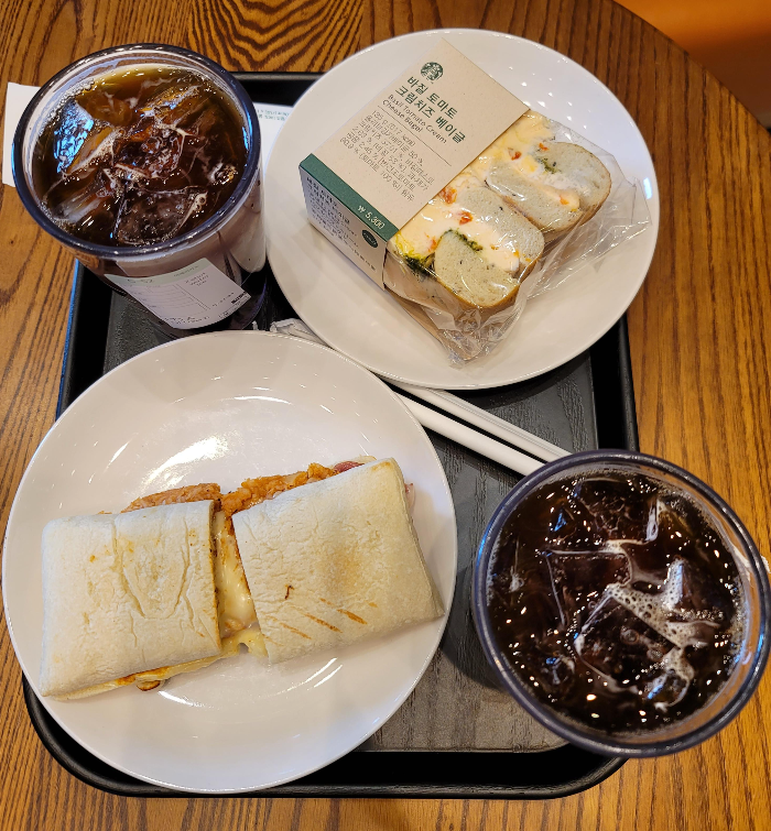 스타벅스 에버랜드점은 외관 부터가 단독건물로 눈에 확 띄는 디자인에 내부도 넓고 좋지만 장소가 장소이니만큼 좀 시끄러운 건 어쩔 수 없는 것 같습니다. 여기서는 시원한 아이스 아메리카노와 바질 토마토 크림치즈 베이글, 바비큐 치킨 치즈 치아바타를 주문하여 먹었습니다.
