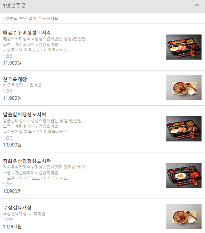 엄마애밥상은 메뉴가 정말 다양한 곳으로 1인분 메뉴만 해도 정말 많고 요기요가 좋은 점이 이렇게 음식 사진과 설명을 보통 다 해 놓는 편이라서 고를 때도 좀 더 수월한 것 같습니다. (사진 밑에 바를 누르거나 좌우 화살표를 누르면 다른 메뉴도 보입니다)
