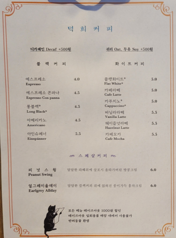 다음에 가게 된다면 피넛스윙을 꼭 마셔봐야겠네요. 그리고 모든 메뉴 테이크아웃 1,000원 할인과 반려동물을 환영한다는 문구가 있는 것을 보니 반려동물 입장 가능 카페인가 봅니다.