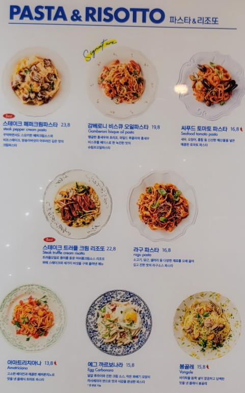 합정역 피자, 리조또 맛집인 포르투7 메뉴판입니다. 포르투7은 파스타가 맛있다고 후기들이 있었는데 이날은 리조또가 더 먹고 싶어서 파스타 대신 스테이크 트러플 크림 리조또(22,800원)와 살라미 피자(17,800원)를 선택하였고, 탁월한 선택이었습니다.
