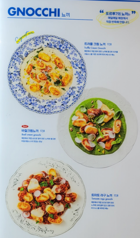 각 테이블에는 이렇게 태블릿으로 주문과 결제까지 할 수 있게 세팅되어 있고, 이탈리안 가정식 포르투7(PORTO7) 이름에 대한 설명이 나온 테이블 세팅지가 있습니다. 음식을 기다리는 동안 구경해 보니,
