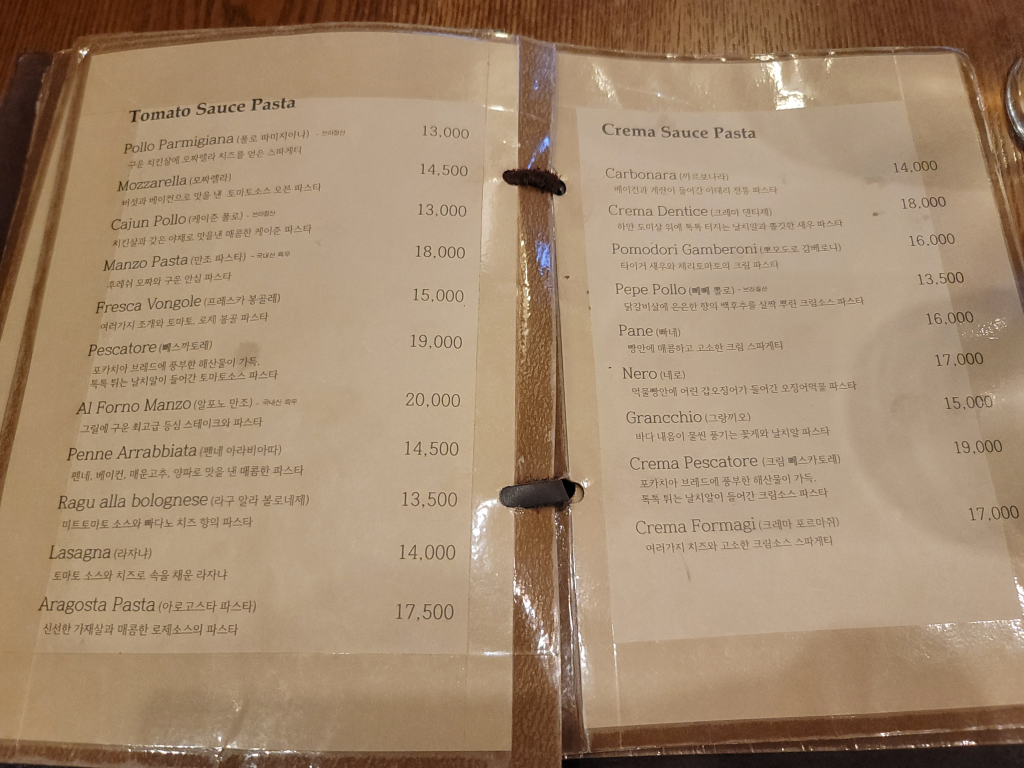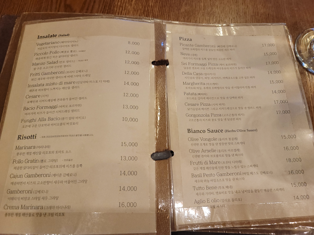 홍대 파스타 맛집인 프리모바치오바치 메뉴판입니다. 항상 빠네 파스타와 피자를 먹어서 다른 메뉴가 이렇게 많다는 건 메뉴판 찍으면서 알았네요.