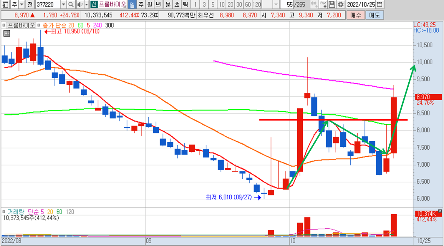 작년 9월에 신규 상장한 곳인데 상장 첫날 최고가(24,250원)를 찍고 그 뒤로 쭉 하락하여 6천원대에 반등하여 현재 5일선 쌍바닥을 만들었는데요 바닥에서 대량거래량은 우선 호재로 보시는 게 좋지만 10월 6일에 역망치형으로 윗꼬리 긴 거래량이 터진 날 매물대와 240일선이 저항으로 작용 중입니다. 그래도 단기 캔들추세(빨간선)는 거래량과 함께 뚫고 올라왔고 20일/60일선이 하락을 멈추고 상승으로 추세전환하였기 때문에 저 빨간선(8300원)을 지지하면서 상승한다면 추후 중장기적으로 상장 최고가 까지도 갈 수 있는 발판을 마련했다고 볼 수 있습니다.