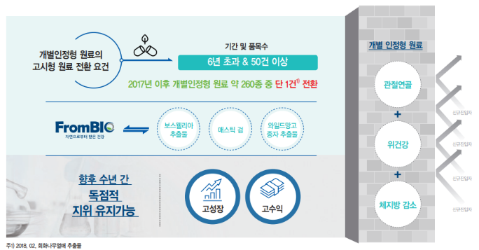 건강식품쪽을 우선 보면 독점적 생산 권한이 부여되는 개별인정형 원료(보스웰리아 추출물, 매스티검, 와일드망고종자 추출물)를 확보하여 관절염과 위 건강 및 다이어트 건강식품까지 개발하고 매출에 큰 성장을 이루어 냈습니다.