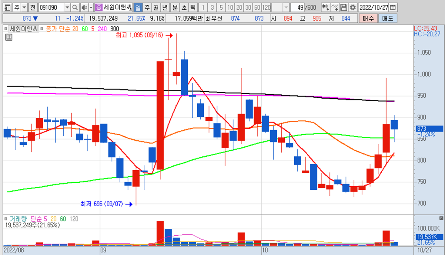 현재 일봉상 5/20일 골드크로스 상승1파 자리고요 장기이평선인 240/300일선 저항을 받고 있는 상황입니다. 하지만 대량거래량과 함께 돌파 시도를 3번이나 하였기 때문에 추후 돌파하게 된다면 정배열 차트를 만들게 될 가능성이 높아 보입니다. 단기로는 천원 중장기로는 1400원대 이상도 상승 여력이 있어 보이는 곳이라 60일선 밑으로 올 때 분할로 매수한다면 좋은 결과를 얻을 수 있지 않을까 싶습니다. 😀