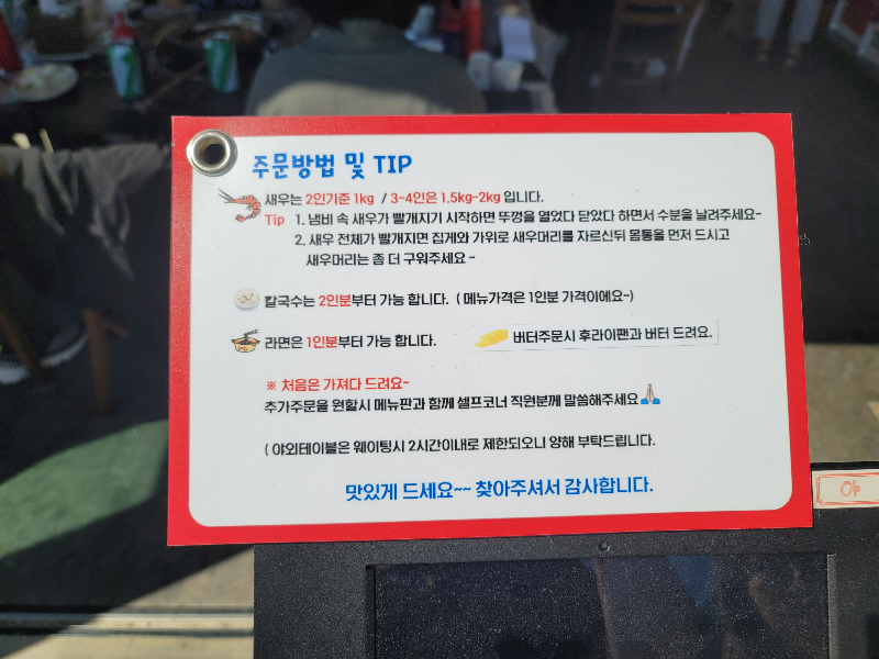 웨이팅 기계에 대하구이 주문 방법 및 먹는 방법에 대한 팁이 적혀 있었는데요. 2인 기준 1kg, 3 ~ 4인 기준 1.5 ~ 2kg을 주문하면 된다고 합니다.