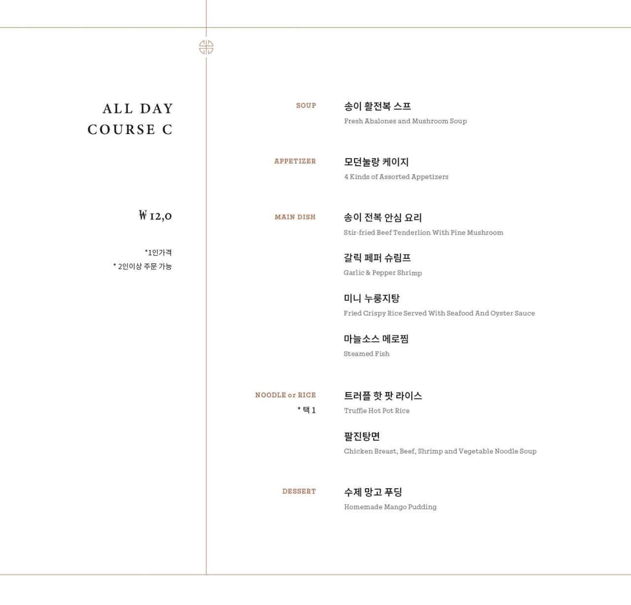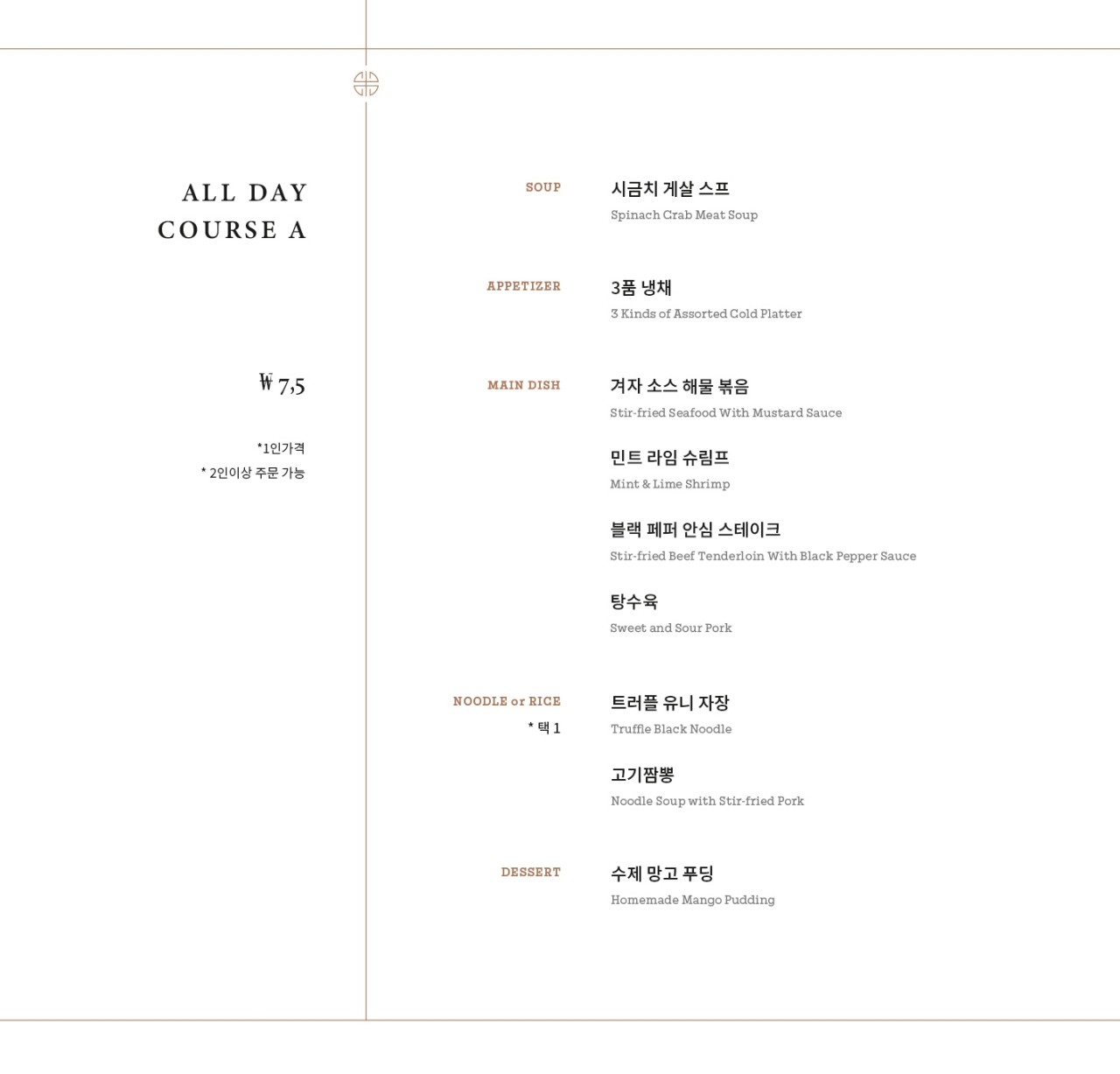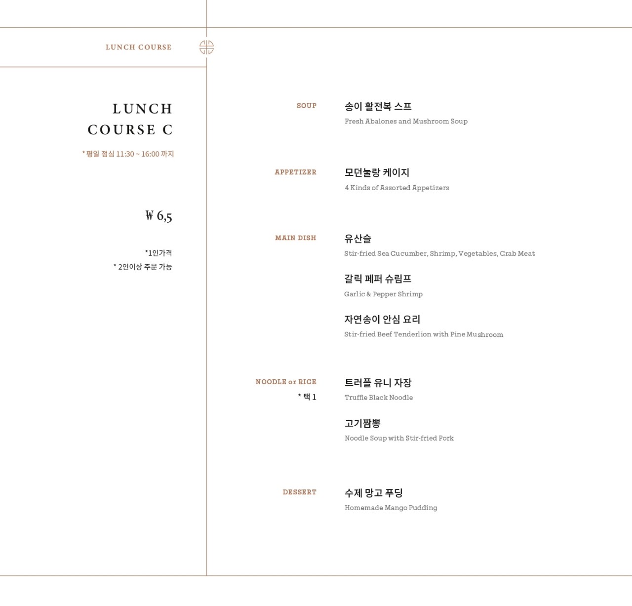 평일 점심시간에 방문했기 때문에 가격은 좀 있지만 다양한 메뉴를 먹을 수 있는 런치 코스 A를 선택했습니다. 참고로 런치 코스 메뉴판에 적힌 가격은 1인 가격이고, 2인이상 주문해야 되며 오픈 시간인 오전 11:30분부터 오후 16시까지 된다고 합니다.