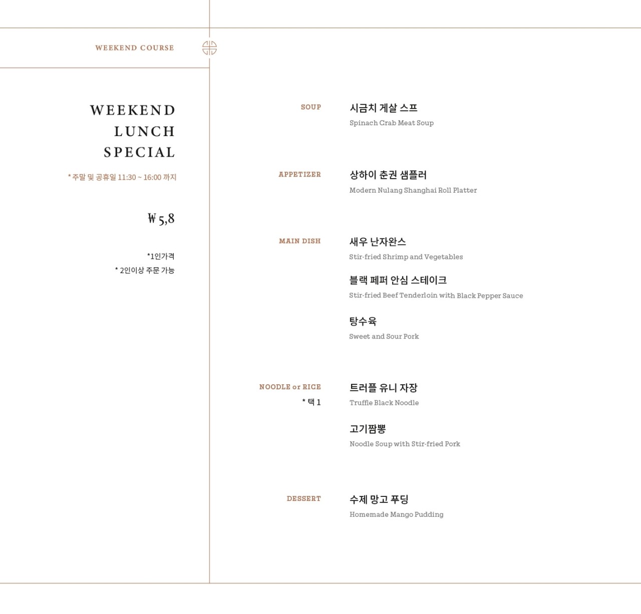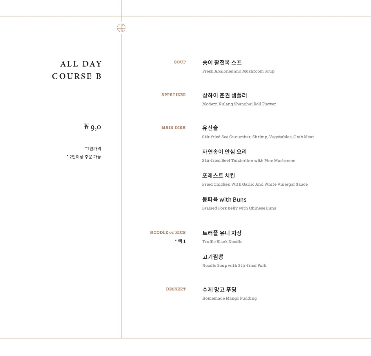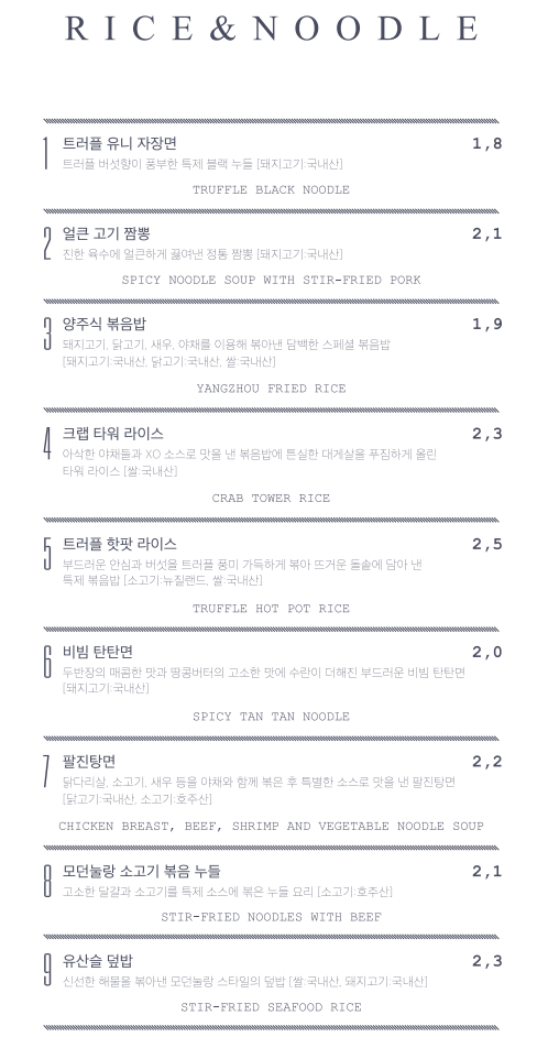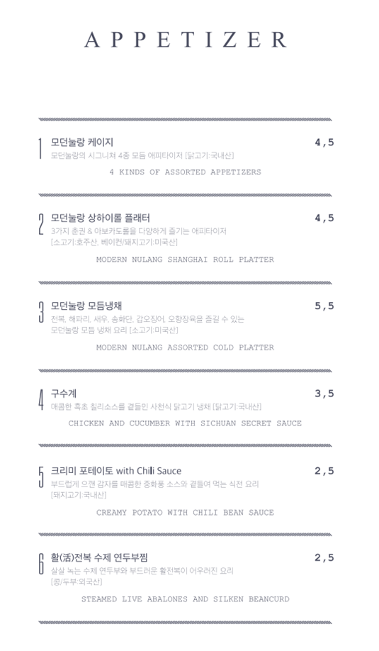 - 가게 소개말: 1930년대 상하이 문화의 현대적인 신여성을 컨셉으로 만들어진 부티크 차이니즈 퀴진(고급 중식 요리).