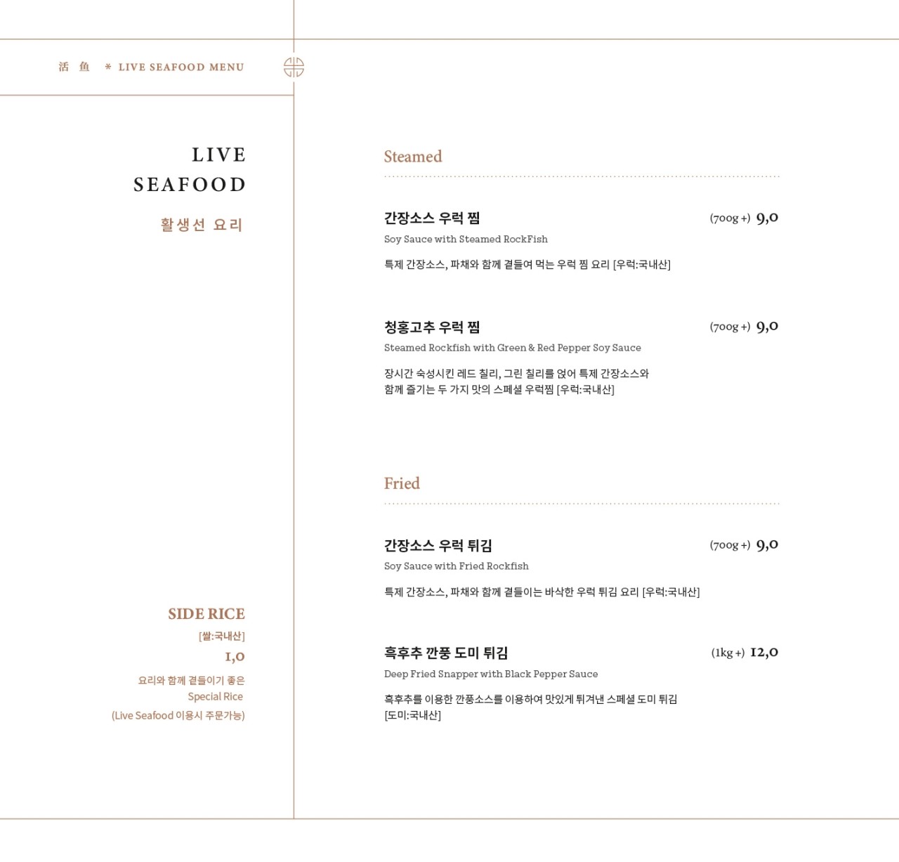 메뉴별로 품목 별로 원산지들이 나와 있습니다. 이렇게 상세하게 대다수의 각 메뉴 원산지를 표시한 곳은 처음 보네요. 최근 후쿠시마 오염수 방사능 수치 초과 뉴스 등 해산물은 불안한 시국에 활생선과 전복은 모두 국내산인 것을 확인할 수 있었습니다.