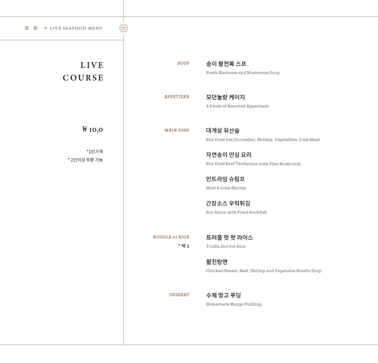 - 영업시간: 매일 11:30 ~ 22:00 / 라스트오더 21:00 / Live 메뉴 및 코스 메뉴는 라스트오더 20:00