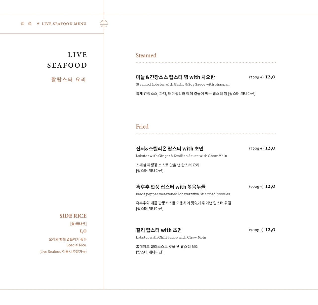 - 잠실점은 실내에 수족관이 있어서 활생선과 활랍스터 메뉴도 있음.