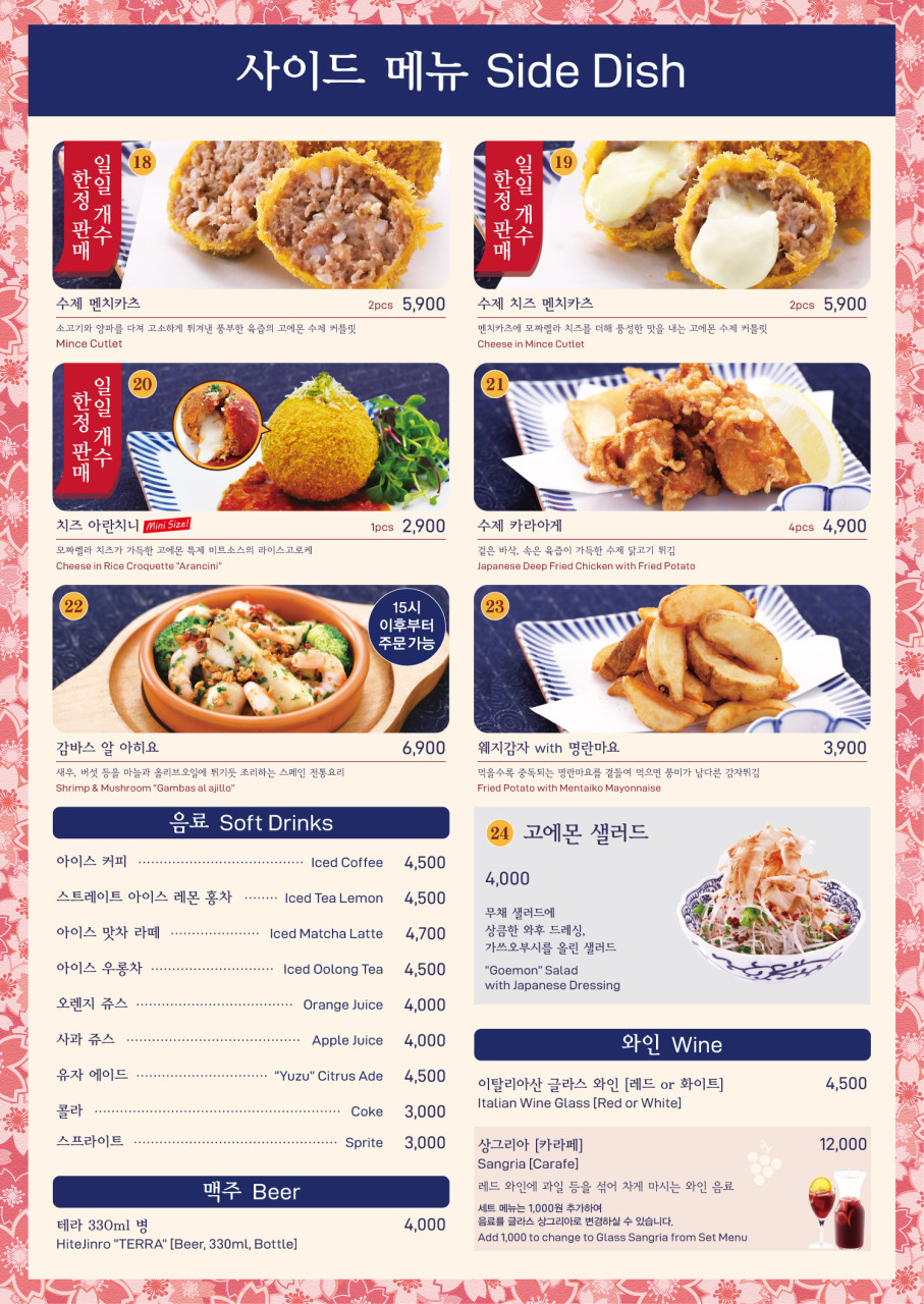 각 테이블마다 있는 태블릿의 티오더로 편하게 주문해 주면 되고요. 요멘야 고에몬의 시그니처인 수플레 오믈렛 멘타이꼬 리조또와 여름한정 메뉴인 토마바질 파스타와 사이드로 멘치카츠를 주문하였습니다.