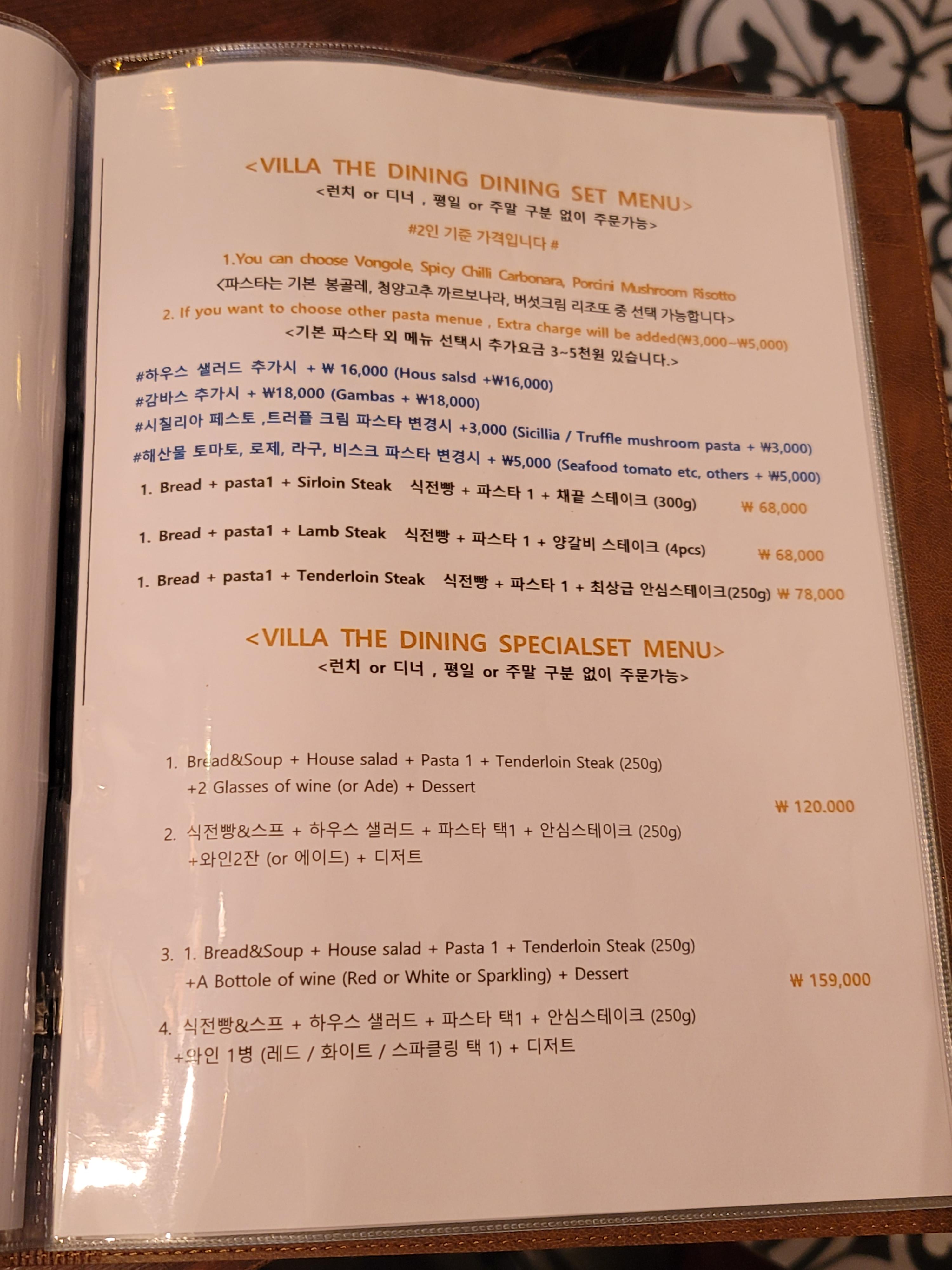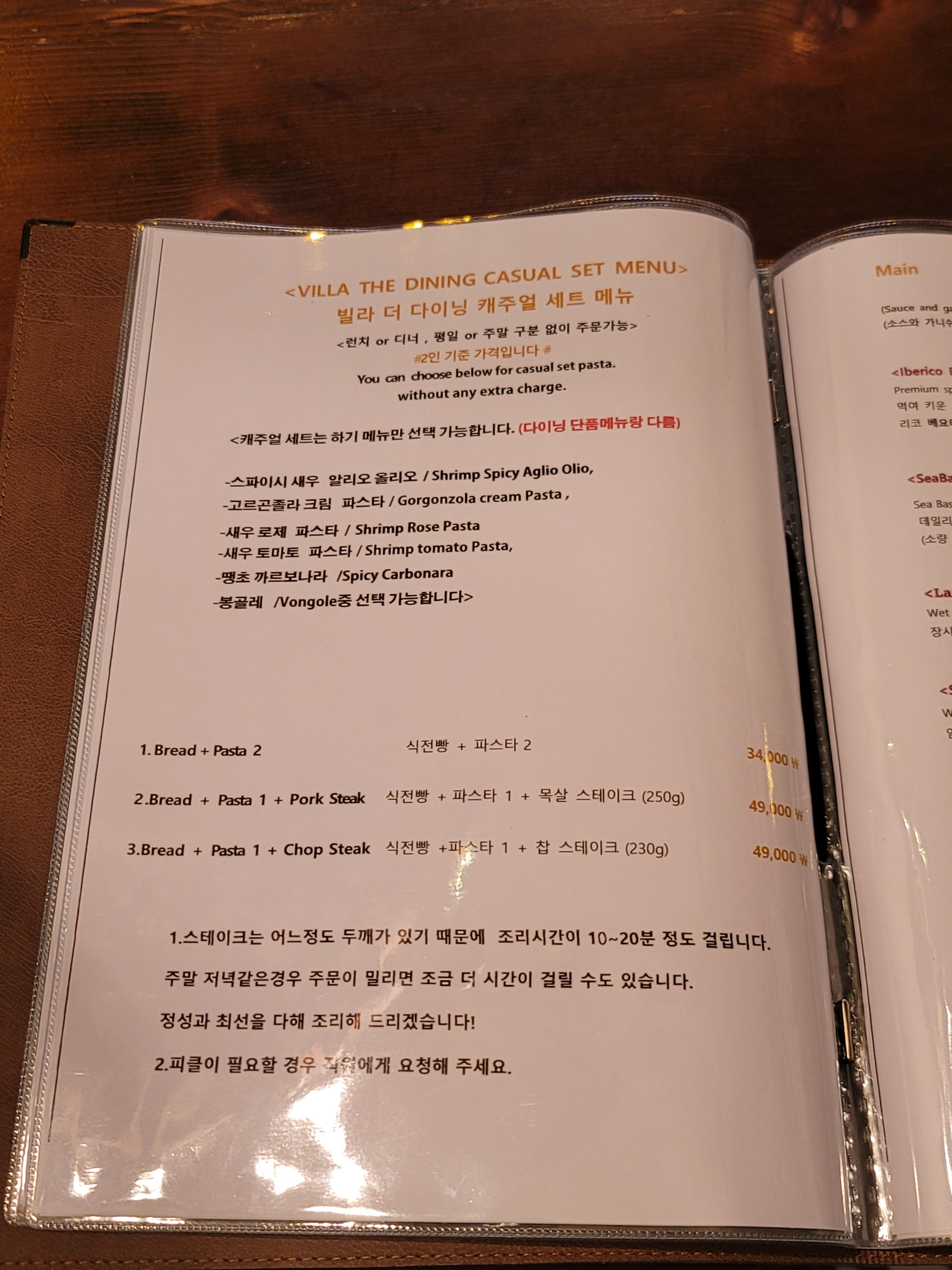 코스 메뉴와 메인 단품 메뉴가 모두 있었고, 저희는 빌라 더 다이닝 캐주얼 세트 메뉴에서 두 번째인 식전빵 + 파스타 1 + 목살 스테이크(250g)를 주문하였습니다.