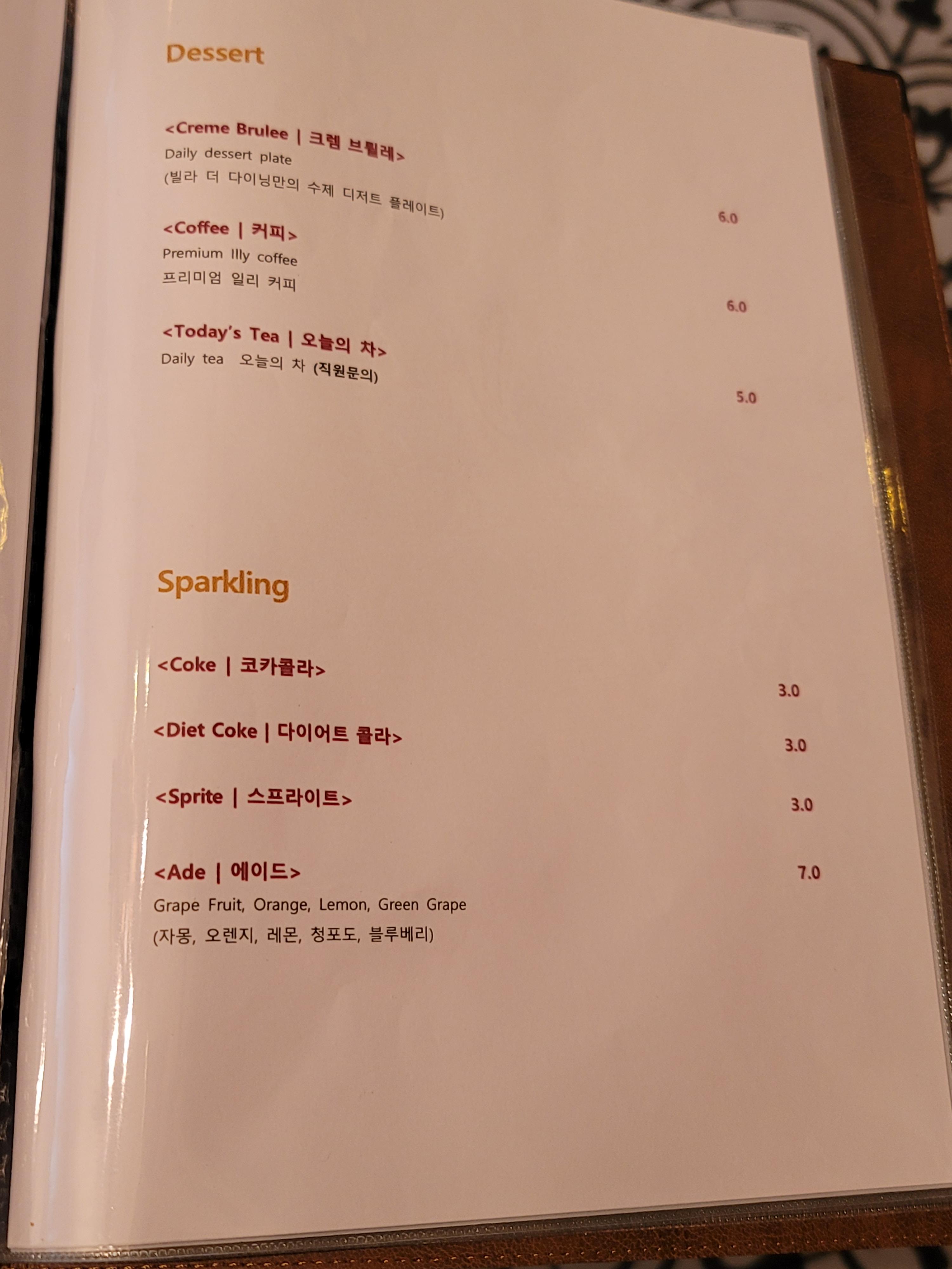 네이버 예약하고 가서 영수증 리뷰까지 작성해 줬는데 식전주를 두개 주던가 다른 걸로 대체해주지 않고 식전주 하나만 주다니... 그때는 시간이 없어서 직원이 영수증 리뷰해야 식전주 준다고 해서 그런가 보다 했는데 지금 보니 크렘블레를 못 받았기 때문에 리뷰 작성해 줄 필요도 없었군요. 😥