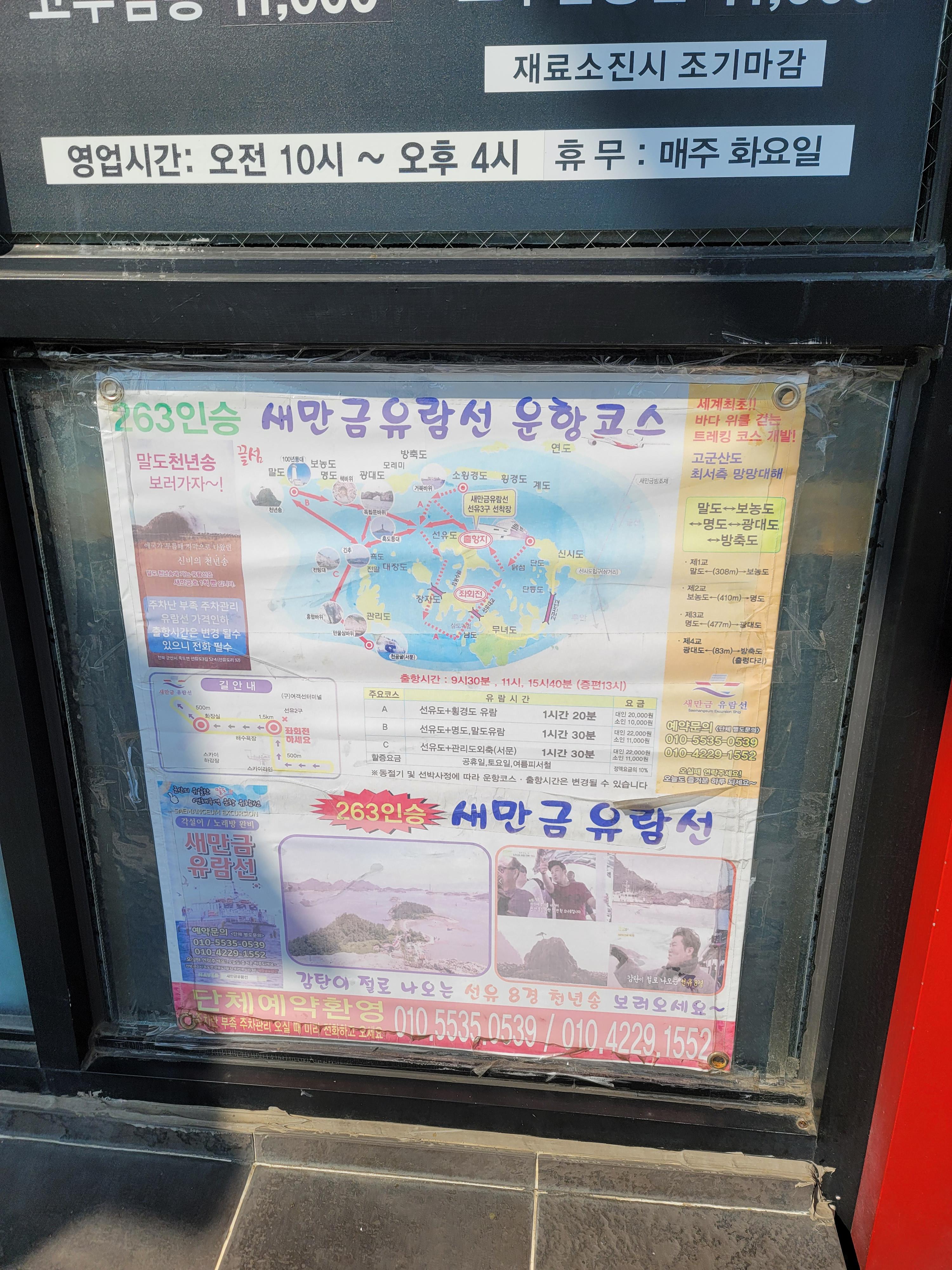 가게 입구 옆 메뉴판 밑에는 좀 뜬금없지만 새만금 유람선 운항코스와 유람시간 및 가격(요금)이 나와있었습니다. 근처에 군산항이 있어서 이런 홍보가 있나 봅니다.