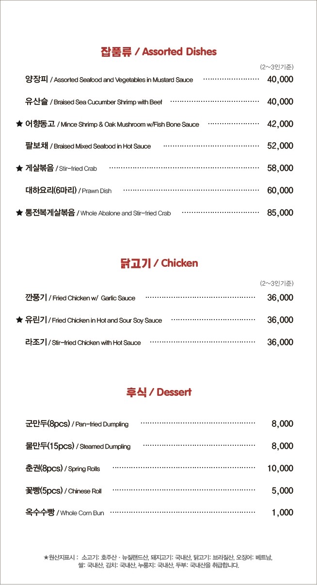 구디역 중국집 맛집답게 입구 카운터 옆에 있는 예약현황판에 모든 룸이 예약자 성함으로 가득 차 있었습니다. 그래서 예약 없이 저희는 홀에 앉았었는데 알고 보니까 어차피 예약은 보통 5인 이상 위주로 되어 있고, 4인 이하도 예약은 되지만 최소 주문 금액이 8만원이라 두 명이서 룸을 이용하려면 비싼 세트메뉴를 시켜야 가능한 곳이었습니다.