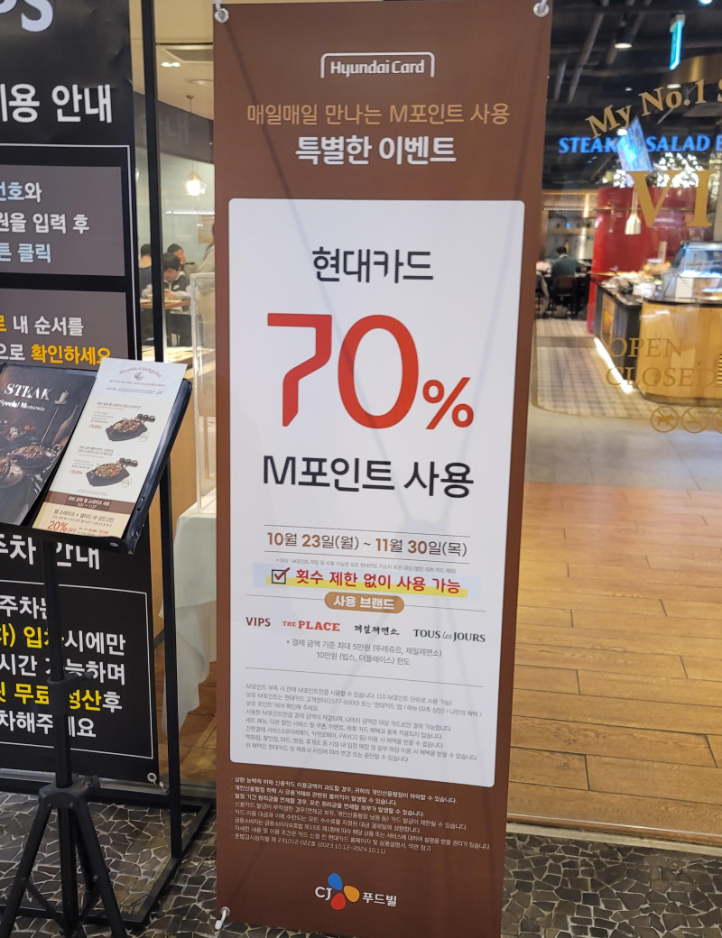 빕스에서는 현대카드 M포인트 사용 이벤트가 종종 생기는데요. 11월에도 무려 M포인트 70% 사용 이벤트가 있었답니다! 지나갔지만 자주 이벤트가 있으니 가기 전에 미리 확인해 보고 날자 맞춰서 가는 것도 좋겠죠!?