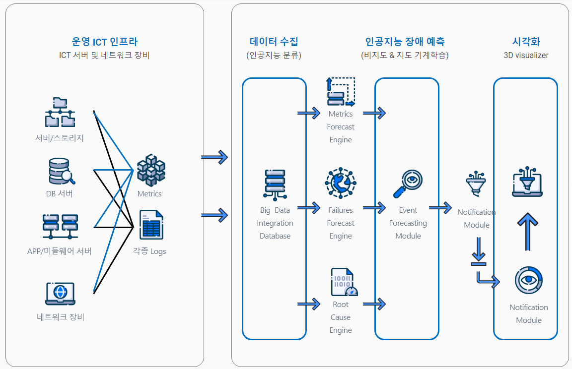 주요제품 중 페타온 포캐스터(PETAON Forecaster)가 바로 실시간 데이터를 수집하고 서버 내에 이상 감지를 20분 내에 찾아주는 이상탐지 기술 기반의 ICT 인프라 모니터링 솔루션입니다. 이 솔루션을 통해 운영 중인 ICT 인프라에서 수집된 정보를 기반으로 아래 그림과 같이 장애 예측과 근본 원인 분석을 제공하게 되는 것이죠!