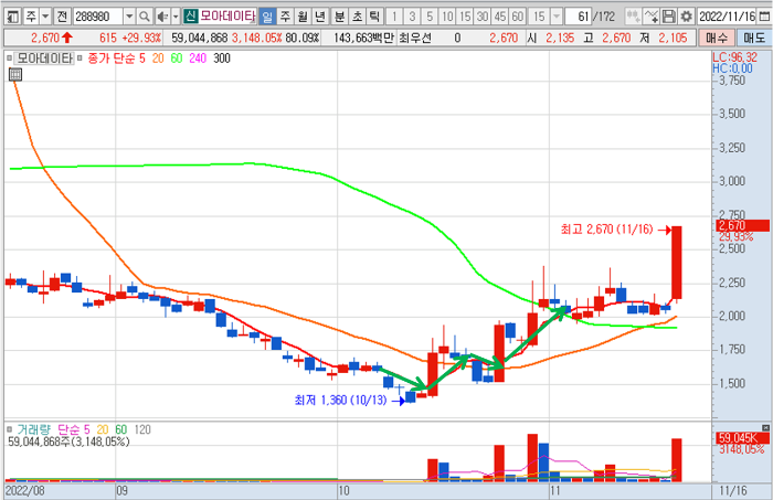 유동주식수가 약 2천만주밖에 되지 않는데 원래는 60일선 같은 중장기 이평선은 여러 번 저항을 받고 뚫어줘야 하지만 앞서 이미 5~6천만주씩 여러번 대량거래를 터트려 놨었기 때문에 한 번에 뚫고 올라온 후 또다시 대량거래를 통해 상한가로 이어지는 그림을 그릴 수 있었습니다.