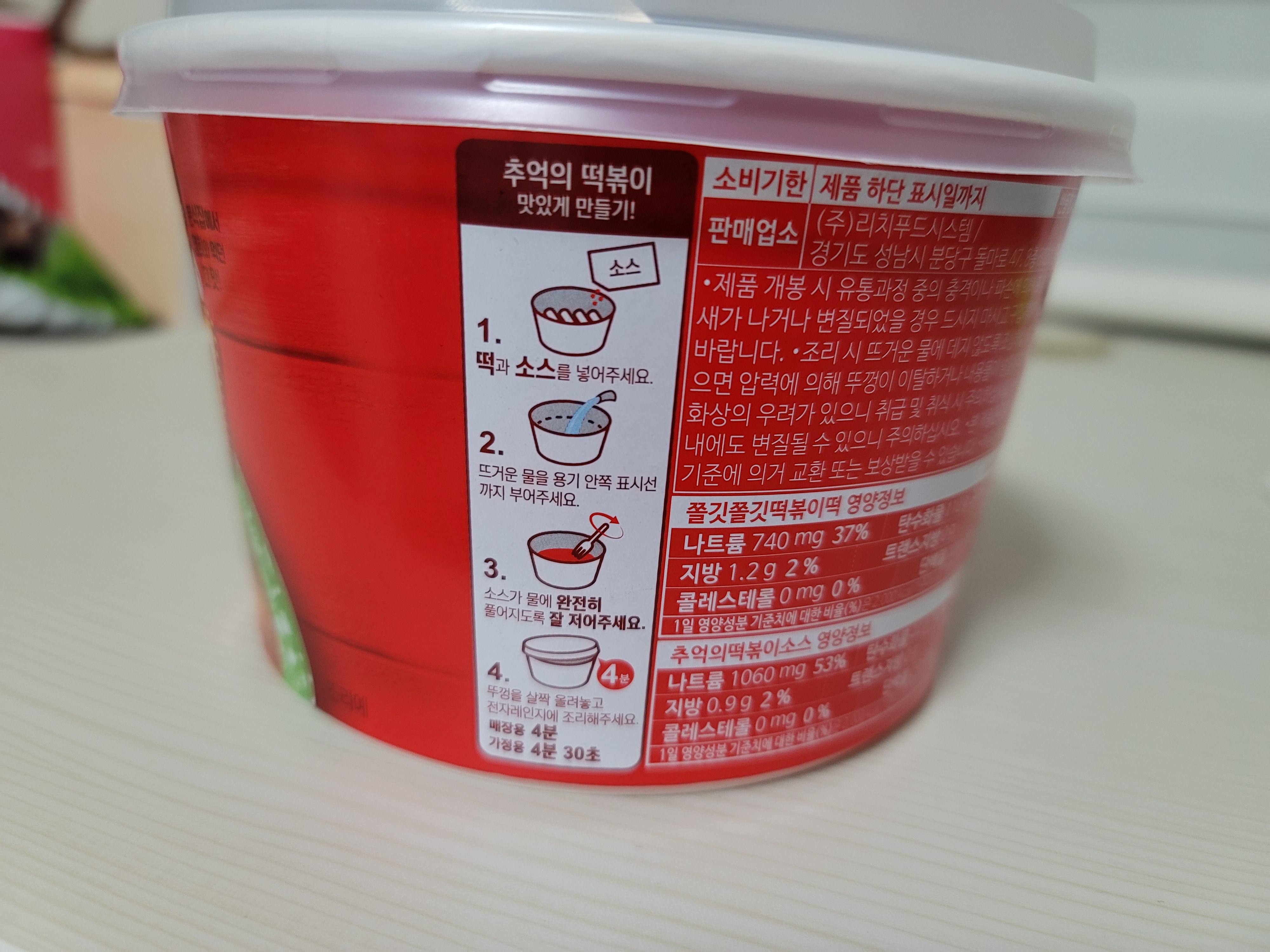 하얀 쌀떡과 진하고 꾸덕한 소스를 용기 안에 넣고 뜨거운 물을 부어 정말 간편하게 조리를 해줬습니다. 소스에서 고추장 향이 확 올라오는데 우선 냄새는 추억을 살짝 자극하는 점에서 합격이네요.