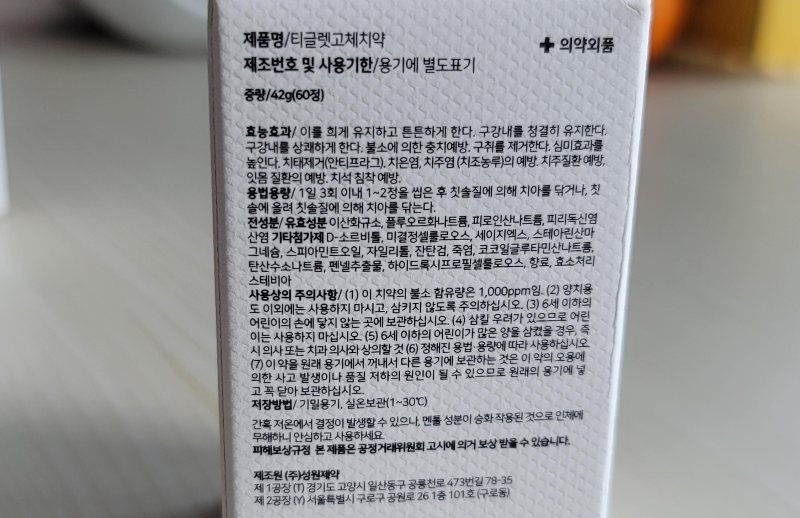 티글렛 레몬 민트향 고체치약의 효능 및 효과와 전성분 표시, 용법용량, 사용상 주의사항, 저장방법(실온보관), 제조원 등의 정보가 뒷면에 나와있고요.