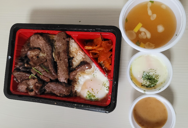 용기 뚜껑을 열면 안에도 매장에서 담은 모양 그대로 음식이 잘 배달 온 것을 볼 수 있고요. 원기정의 로스트비프 덮밥은 소고기가 정말 두툼하면서 한가득 들어 있는 모양이 너무 맛있을 거 같네요.