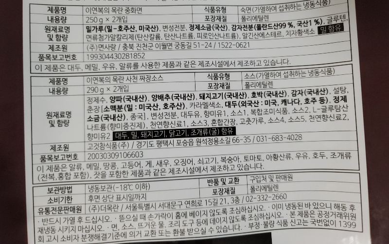 이렇게 뒷면에는 목란 사천짜장면 밀키트의 원재료 원산지 정보와 보관방법 등의 정보들이 적혀있고요.