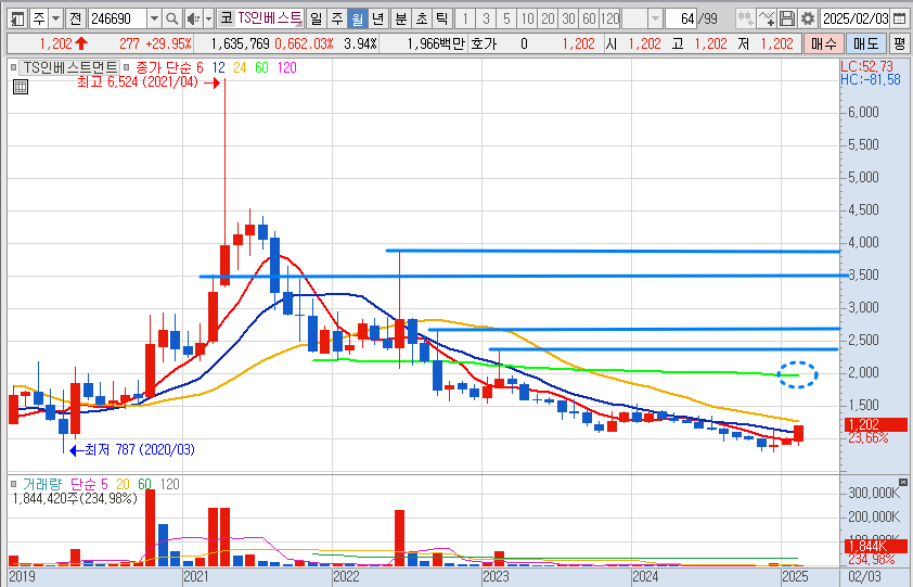 - 현재 TS인베스트먼트 차트를 보면 60월선과 2023년 고점 저항선에서 거래량 없이 흘러내린 구간이기 때문에 이번 이슈로 충분히 2천 원 위까지 주가가 상승할 가능성이 높아 보이는 차트입니다.
