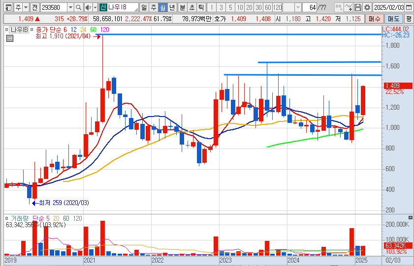 - 나우IB 차트의 경우, 현재 월봉 차트 정배열을 만드는 자리에서 강한 장대양봉이 나왔고, 지난 3년간 횡보를 하면서 거래량도 꾸준히 만들어 왔기 때문에 이번에 상승 추세를 타면 2021년 고가를 돌파하여 신고가를 달성할 가능성이 상당히 높아 보입니다.
