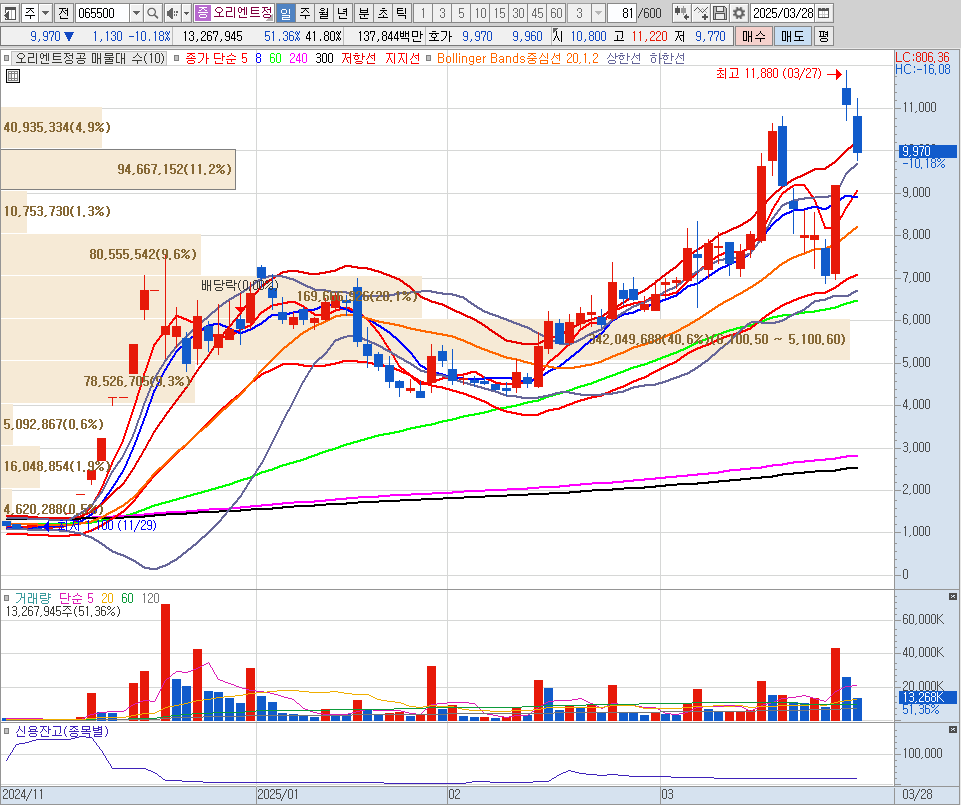- 오리엔트정공: 작년 거래량 봉의 강한 지지구간과 상승 추세의 20, 60일선 지지.