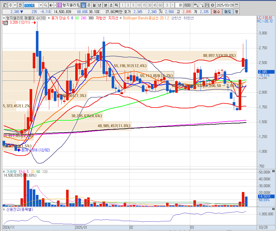 - 형지엘리트: 정배열 차트 만들어지는 중, 60일선 지지 시 긍정적 흐름 예상.