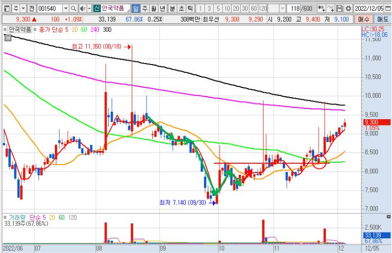 8월 5/20일선 데드크로스와 함께 하락 7파동 후 반등하여 추세전환선(빨간선)을 지지하면서 거래량과 함께 급등 중입니다. 현재 단기 급등으로 인해 3일간 단일가 거래 중인데 부럽네요. 바닥에서 5/20일선 골드크로스를 거래량과 함께 20% 전후 등락이 나온 날이 있으면 그런 종목은 한번 눈여겨보고 있어도 좋습니다. 비피도처럼 거래량 확 줄인 채로 어느 정도 눌림 자리 주면서 횡보하다가 슈팅 가는 경우가 많이 있기 때문이죠. 중장기 이평선은 거래량이 없으면 한 번에 뚫기 힘든데 거래량과 함께 뚫어버리면서 급등을 갈 수 있었던 거죠. 이게 내 주식이었어야 하는데...! 다들 비슷한 마음이신 거 압니다.😆